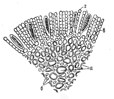 Поперечный срез через слоевище: а — клетки центрального слоя, б — клетки ризоидальных нитей, в — периферические нити, г — спорангии