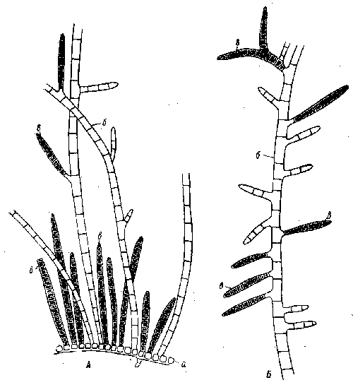 А — основание слоевища; Б — часть вертикальной нити; а — базальная нить, б — вертикальная нить, в — многоклетные спорангии
