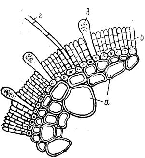 Поперечный срез через слоевище: а — клетки центральной части нити, б — многоклетные спорангии, в — парафизы, г — волосок