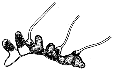 Часть слоевища со спорангиями Микроскопические стелющиеся, неправильно разветвленные нити, от них отходят вверх одиночные клетки или группы клеток, грушевидной формы, несущие волоски (щетинки). Эндофит. В межклетниках корового слоя, в рыхлом слоевище красных и бурых водорослей.