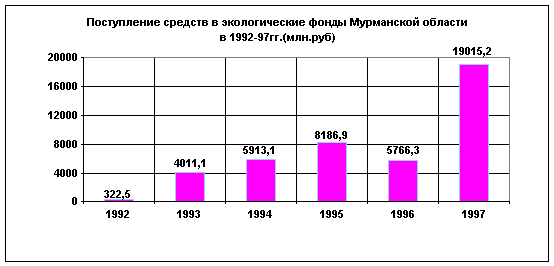Принятые эти и другие меры способствовали тому, что за 1997 год в экологические фонды области поступило средств больше в 3.3 раза, чем за 1996 год.