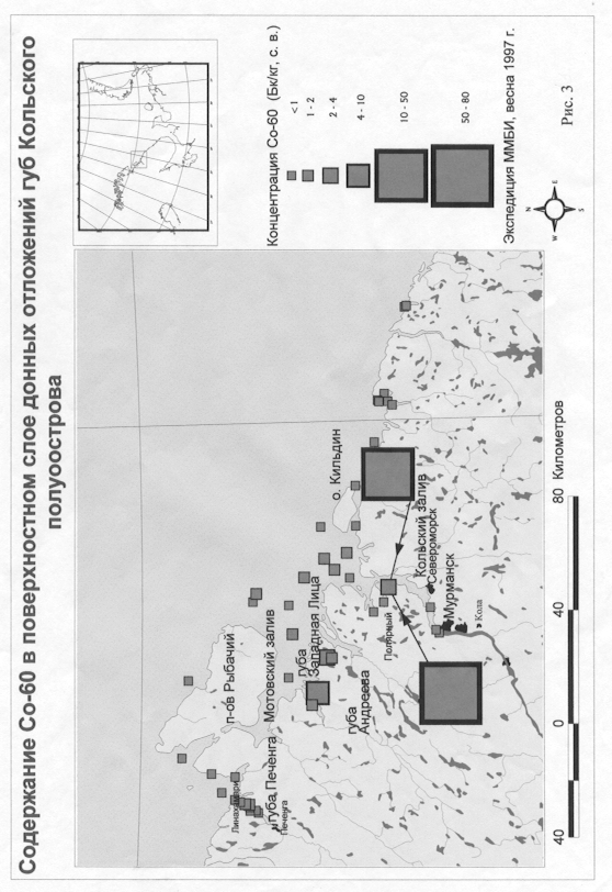 В губах Кольского залива плотность антропогенных радиоактивных осадков закономерно возрастает в расположении баз атомного флота. В Сайда губе, примерно в 2-3 км от места отстоя реакторных отсеков утилизированных подводных лодок, донные отложения содержат цезий-137 и кобальт-60 на уровне от 3-14 до 34 Бк/кг и от 7-5.0 и до 12 Бк/кг соответственно. В морских осадках имеется также плутоний-239, 240 на уровне 1.6 Бк/кг. В губе Оленья, на расстоянии 800 м от судоремонтного завода "Нерпа", концентрация цезия-137, кобальта-60 и плутония-239, 240 составляет 2-14, 1-12 и 1,6 Бк/кг. Сравнительно много кобальта-60 (до 22-24 Бк/кг), плутония-239, 240 (2.2 Бк/кг) и цезия-137 (до 15-22 Бк/кг) в донных отложениях губ Пала и Екатерининская в районе г.Полярный.