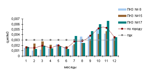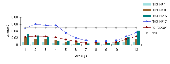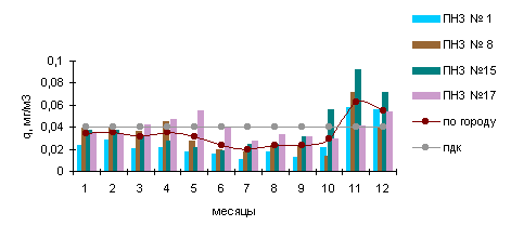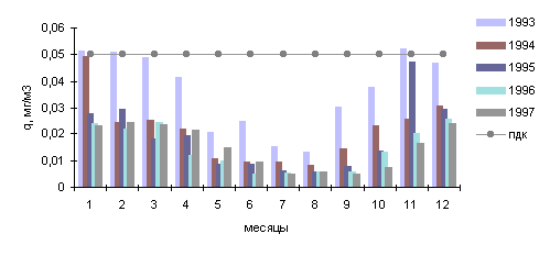 В 1997г. среднемесячные концентрации в городе были выше нормы в 1.6 раза в мае и июле, в 2.8 раза - в июне, а в зимние месяцы - в феврале (1.5 ПДК) и октябре (1.3 ПДК).