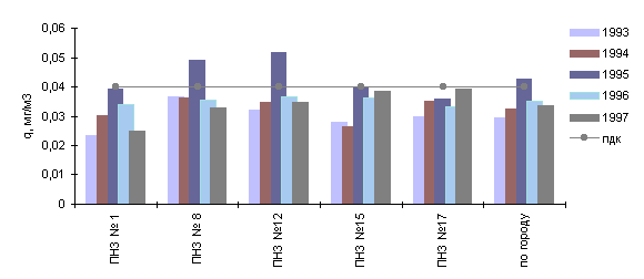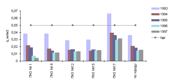 В 1997 г. в целом по городу средняя за год концентрация диоксида азота - 0.03 мг/м3 - несколько ниже уровня ПДК. Среднегодовая концентрация достигала уровня санитарной нормы в южном (ПНЗ №15) и восточном (ПНЗ № 17) районах.