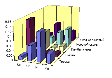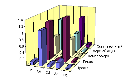 Содержание тяжелых металлов (Cd, Hg, Cu, Zn и др.) в тканях основных видов промысловых рыб ниже допустимых санитарных норм. Преобладали железо и цинк, а содержание никеля, хрома и кобальта часто было ниже порога обнаружения. По наблюдениям 1998 г. сохраняется тенденция к медленному снижению концентраций цинка, ртути, мышьяка, кадмия и свинца в мышцах рыб. В прибрежных районах эта тенденция нарушена. Наиболее токсичные металлы - ртуть, кадмий и мышьяк в большей степени накапливались в мышцах звезчатого ската и пикши, выловленных на Финмаркенской банке. Морской окунь в большей степени накапливал медь, что связано, по-видимому, с относительно высоким содержанием жиров в его мышцах. Отмечен относительно повышенный уровень содержания свинца в треске, нагуливающейся на Финмаркенской банке, что может быть вызвано как повышенным антропогенным влиянием, так и возрастными особенностями особей.