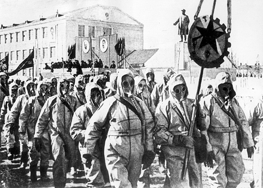 Кировск. Осоавиахимовцы в колоннах демонстрантов. 1937 г. The town of Kirovsk. Members of Osoaviakhim in the column of demonstrators, 1937